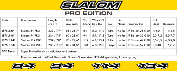 La nueva generación de tablas JP Slalom shapeadas por Werner Gnigler y aprobadas por Micah Buzianis, incluyen 4 tablas con 84, 94, 114 y 134 litros y una linea de 8 alerones de Slalom, que estarán disponibes a principios de Marzo.