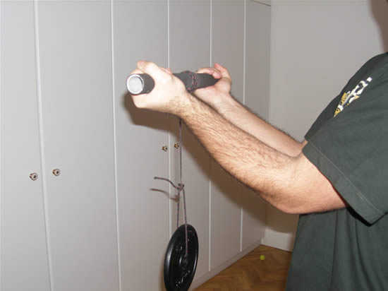 Con las palmas hacia abajo, se trata de enrollar el tubo para levantar la pesa. El cabo queda hacia nosotros.