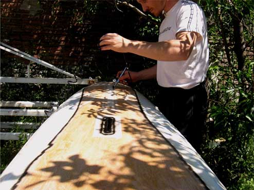 En cubierta, pintamos con resina y tapamos el poro con resina espesada con microbalones, laminamos dos piezas en carbon kevlar 180grs y un paño en fibra de vidrio de 100gr.