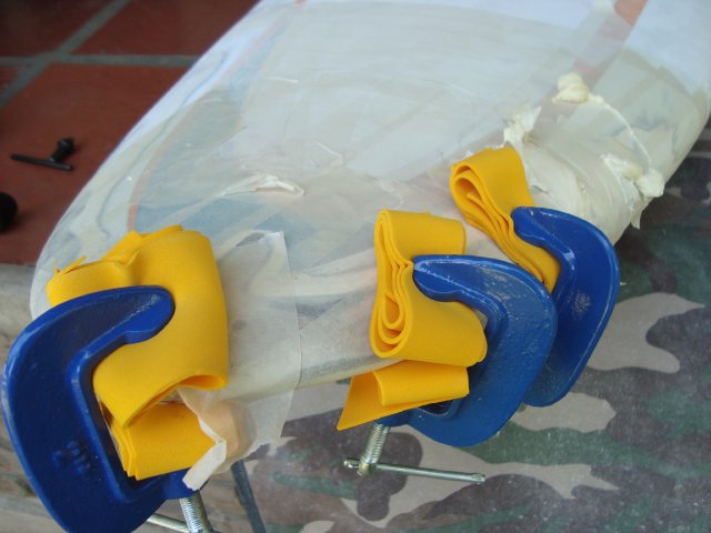 Laminaremos 3 paños con tejido en fibra de vidrio, impregnados en resina epoxy. El primero será una cinta continua de 2cm cubriendo todo el canto, el segundo y el tercero serán mas anchos cubriendo toda la zona a reparar (haremos pequeños cortes en sus costados para que los paños se adapten a la curvatura del canto de la proa y así no dejar arrugas en el mismo), montando el ultimo mas allá del limite de lo lijado, cubrimos seguidamente con plástico perforado (envoltorio a alimentos y barras de pan). Lo tensamos con cinta de embalar, eliminado así el exceso de resina y garantizando también que el laminado quede comprimido. Ponemos papel secante encima para que quede allí la resina sobrante y envolvemos todo con cinta de embalar tensando ligeramente.