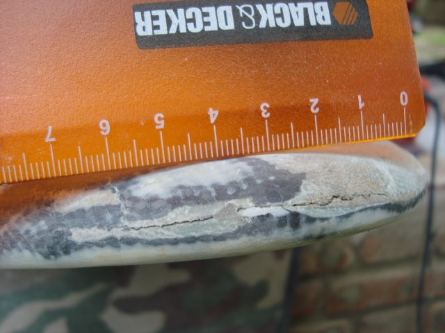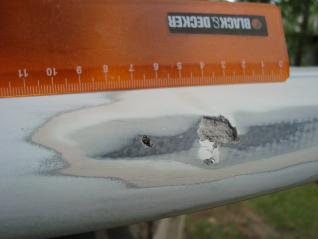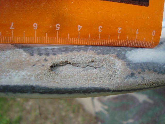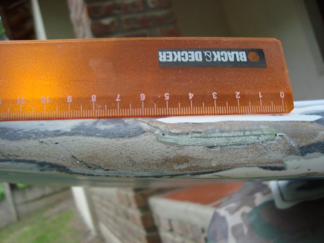 He decidido esta tarde quitar todo el pegamento epoxi que desde hace varios meses vengo poniendo a la proa porque son varios los mastilazos que le pego y me he encontrado con esto.
