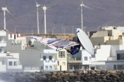 A la 1 en punto todo estaba preparado para el comienzo de la primera eliminatoria de Freestyle ¡¡con un viento de 40 nudos!! En la primera ronda fueron Nina Tjernberg (S-165, North), Uli Hoelzl (AUT-123, F2/ Neil Pryde) y Ruth Elliot (K-696, Starboard) las que obtuvieron la Victoria pasando a la siguiente ronda. En la primera manga de la segunda ronda Yolanda Freites de Brend (V-26, Fanatic/ North) echo fuera a Ania Ostrowska (POL-00, Fanatic) y la primera gemela en entrar al agua, Iballa Moreno (E-63, Mistral/ North), hizo lo correspondiente con Nina Tjernberg. En la siguiente manga Junko Nagoshi (J-11) se metía entre las 8 ultimas competidoras a costa de Andrea Hausberg (G-212), también pasó Karin Jaggi que batió a Anna Jonsson (S-78)