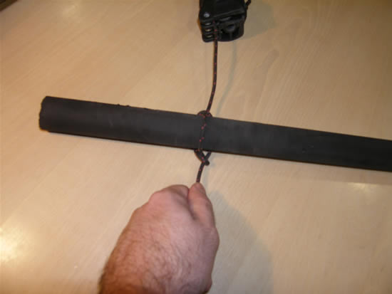 Una vez hemos montado la vela y tensado a mano sin hacernos daño, cogemos el cabo y hacemos un lazo como en la foto.